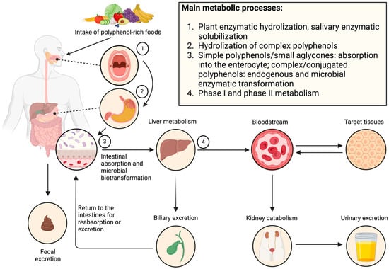 Dietary polyphenols have poor bioavailability, meaning that the concentration of parent compounds (i.e., compounds originally found in foods) that enter peripheral circulation and can reach target tissues is low and kinetically disadvantaged. Instead, the small aglycones that can be absorbed into enterocytes via passive or active transport undergo phase I and phase II metabolism in the liver before reaching circulation. A small proportion of liver-metabolized polyphenols can enter the entero-hepatobiliary circulation, returning to the small intestine for further catabolism and/or excretion. Further, efflux transporters in enterocytes pump dietary polyphenols and their phase I/II metabolites back into the intestinal lumen for eventual excretion, effectively reducing their net absorption. Polymeric or conjugated polyphenols (i.e., polyphenols bound to large molecules such as polysaccharides) accumulate in the colon, where most polyphenol–microbial interactions take place. Microbial metabolites can be absorbed into colonocytes and undergo further biotransformation in the liver before reaching the bloodstream and target tissues, or they can be excreted in the feces. Circulating metabolites undergo kidney catabolism and are excreted in the urine. Figure 1 presents a simplified model for polyphenol absorption, metabolism, and excretion. As the digestive route of polyphenols is beyond the scope of this review, we direct the interested reader to available reviews on the topic [13,14,15,16].