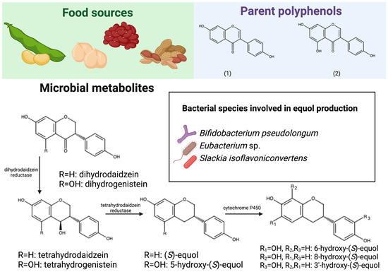 Figure 3. Legumes like soybeans, chickpeas, beans, and peanuts are dietary sources of parent polyphenolic compounds (1) daidzein and (2) genistein (isoflavones). Upon ingestion, these polyphenolic compounds are poorly bioavailable and accumulate in the lower gastrointestinal tract. Bacterial species in the colon are involved in the catabolism of isoflavones. Main catabolic reactions are de-glycosylation to release the polyphenolic aglycone and sequential hydrogenation and dehydroxylation reactions, generating equols. The alternative pathway involving ring cleavage and generation of O-desmethylangolensin is not shown in this figure. Created with BioRender.com. Chemical structures created with Marvin JS (Chemaxon, Budapest, Hungary).