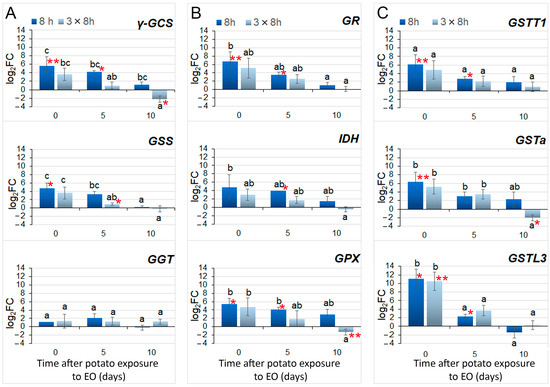 3.5. Expression of Genes Involved in Glutathione Metabolism Pathway in Potato Plants Exposed to French Marigold EO