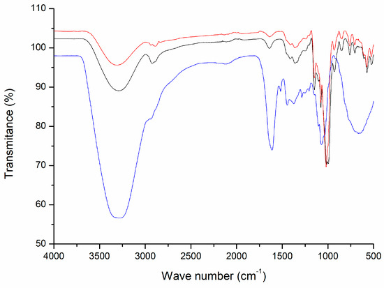 FTIR spectra for different samples. BOLDO extract (blue line), maltodextrin (black line), and Treatment 3 as a model (red line).