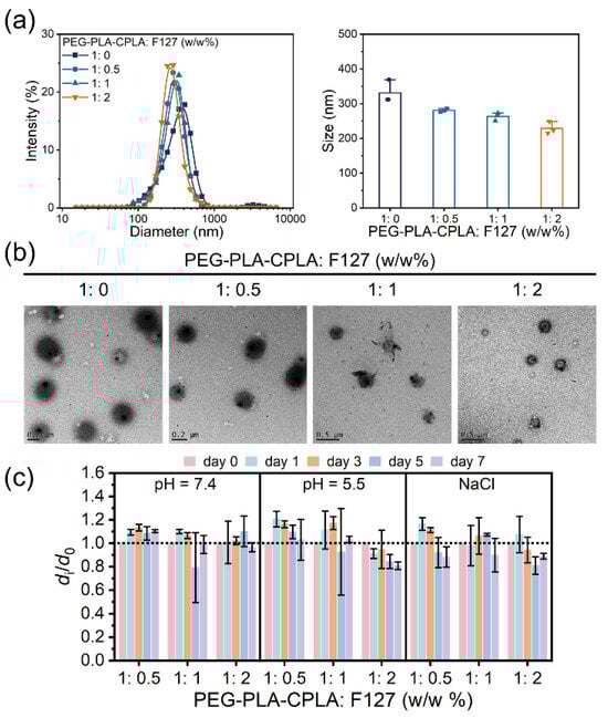 (a) Size distribution and average size of PEG-PLA-CPLA/F127 NPs prepared with different weight ratios of PEG-PLA-CPLA to F127 (1:0.5, 1:1, and 1:2); (b) TEM images of PEG-PLA-CPLA/F127 NPs. (c) di/d0 values of PEG-PLA-CPLA/F127 NPs in PBS buffer at pH = 7.4 and 5.5, and NaCl, as a function of increased incubation time.