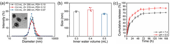 Size distribution of STS-loaded NPs and average particle size (a) during the first emulsion stage under varying aqueous-phase volumes; and (b) drug release profiles of STS-loaded NPs in PBS buffer at pH 7.4 and 5.5. (c) In the formulation of STS-loaded NPs, the ratio of PEG-PLA-CPLA to F127 was 1:0.5 (w/w%), with a fixed STS mass of 5 mg.