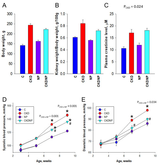 Effects of STS-loaded NPs on (A) body weight, (B) left kidney weight to body weight, (C) plasma creatinine level at week 9. (D) Systolic blood pressure and (E) diastolic blood pressure from week 3 to week 9. n = 8/group. A two-way ANOVA was performed for statistical analysis. PCKD×NP, interaction of CKD × NP; * p < 0.05 vs. C, # p < 0.05 vs. CKD.