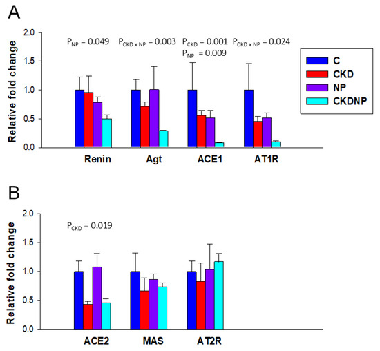 Renal mRNA expression of (A) the classical axis and (B) the nonclassical axis of the RAS. n = 8/group. A two-way ANOVA was performed for statistical analysis. PCKD×NP, interaction of CKD × NP.