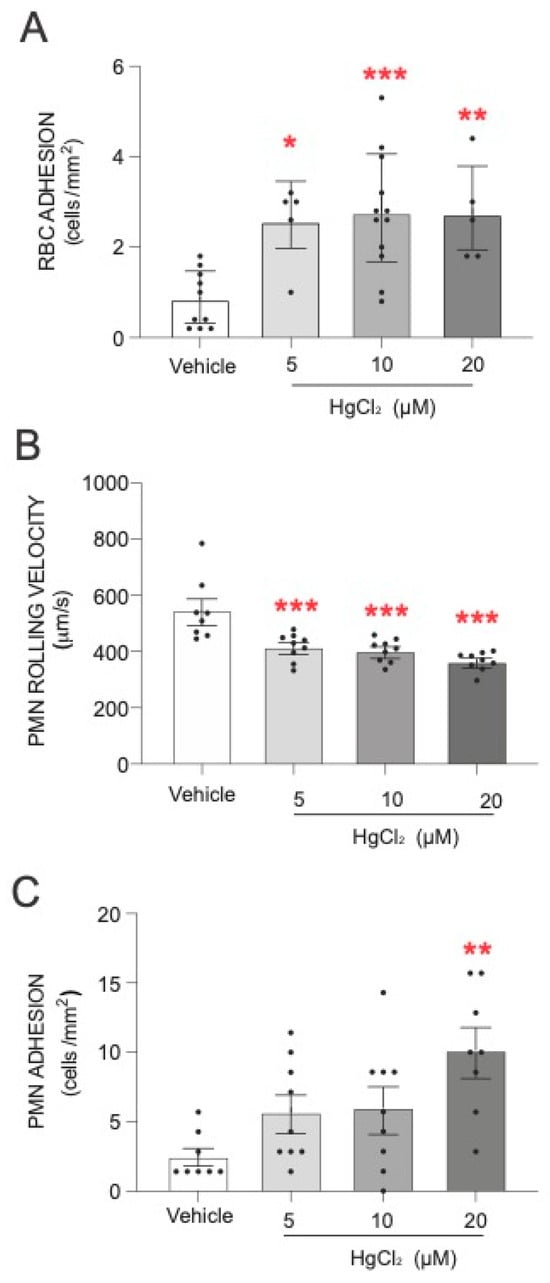 Effects of HgCl2 on RBCs or PMN–endothelial-cell interactions. RBCs (Red Blood Cells), PMNs (Polymorphonuclear cells), and/or HUVECs (Human Umbilical Vein Endothelial cells) were incubated (RBCs/PMNs for 4 h and HUVECs for 24 h) with HgCl2 (5–20 µM) or a vehicle (DMSO). After assembling the flow chamber, we evaluated the interactions of RBCs (A) and PMNs [rolling velocity (B) or adhesion (C)] with HUVECs. Data are presented as the mean ± S.E.M. (n ≥ 4). * p < 0.05, ** p < 0.01 or *** p < 0.001 indicate statistical significance vs. the corresponding value in the vehicle-treated group (ANOVA, followed by Newman–Keuls test).