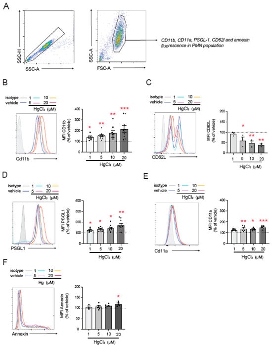 Effect of HgCl2 on the expression of adhesion molecules in PMNs. PMNs (Polymorphonuclear cells) were treated (4 h) with HgCl2 (1 µM, 5 µM, 10 µM, and 20 µM) or a vehicle and the expression of the adhesion molecules CD11b (B), CD62L (C), PSGL-1 (D), and CD11a (E) and of the extracellular side of the membrane phospholipid PS (F) was measured by flow cytometry following the gating strategy shown in (A). Fluorescence values are expressed as a percentage of median fluorescence intensities of the control cells (vehicle, dotted line). Data are presented as the mean ± S.E.M. (n ≥ 4). * p < 0.05, ** p < 0.01 or *** p < 0.001 indicate statistical significance vs. the corresponding value in the vehicle-treated group (ANOVA followed by Newman–Keuls test). PSGL-1: P-selectin glycoprotein ligand-1.