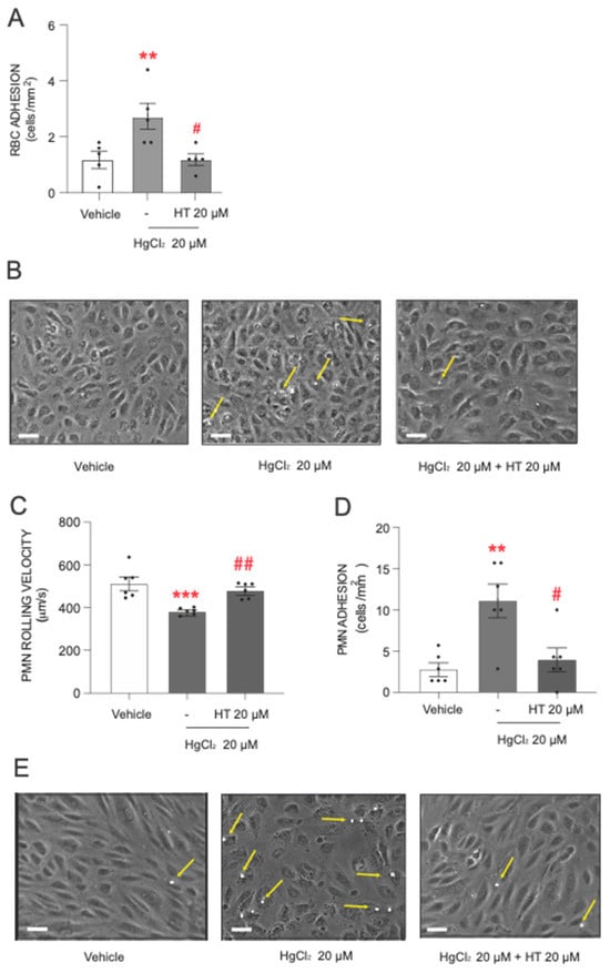 Protective effects of hydroxytyrosol on HgCl2-induced RBC or PMN adhesion to endothelial cells. RBCs (Red Blood Cells), PMNs (Polymorphonuclear cells), and/or HUVECs (Human Umbilical Vein Endothelial cells) were incubated (RBCs/PMNs for 4 h and HUVECs for 24 h) with HgCl2 20 µM) or a vehicle (DMSO). In some cases, cells were pretreated with hydroxytyrosol (HT) 20 µM 15 min prior to the HgCl2 treatment. After assembling the flow chamber, we evaluated the interactions of RBCs (A) or PMNs [rolling velocity (C) or adhesion (D)] with HUVECs. (B,E) are representative images of RBC– and PMN–endothelial-cell interactions, respectively. Scale bar: 100 µm. Yellow arrows indicate RBC or PMN adhere to HUVECs. Data are presented as the mean ± S.E.M. (n ≥ 4). ** p < 0.01 or *** p < 0.001 indicate statistical significance vs. the corresponding value in the vehicle-treated group, while # p < 0.05 or ## p < 0.01 indicate statistical significance vs. the corresponding value in the HgCl2-treated group (ANOVA followed by Newman–Keuls test).