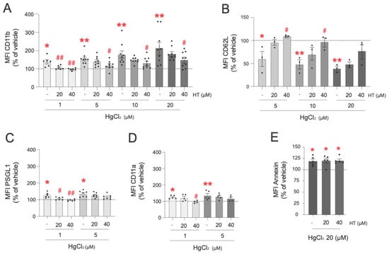 Protective effects of hydroxytirosol on the expression of adhesion molecules in PMNs induced by HgCl2. PMNs (Polymorphonuclear cells) were treated (4 h) with HgCl2 (1 µM, 5 µM, 10 µM, and 20 µM) or with a vehicle. In some cases, cells were pretreated with hydroxytyrosol (HT) 20 µM or 40 µM 15 min before the HgCl2 treatment. Subsequently, the expression of the adhesion molecules CD11b (A), CD62L (B), PSGL-1 (C), and CD11a (D) and of the extracellular side of the membrane phospholipid PS (E) were measured by flow cytometry. Fluorescence values are expressed as a percentage of the median fluorescence intensities of the control cells (vehicle, dotted line). Data are presented as the mean ± S.E.M. (n ≥ 4). * p < 0.05, ** p < 0.01 indicate statistical significance vs. the corresponding value in the vehicle-treated group, while # p < 0.05 or ## p < 0.01 indicate statistical significance vs. the corresponding value in the HgCl2-treated group (ANOVA followed by Newman–Keuls test).