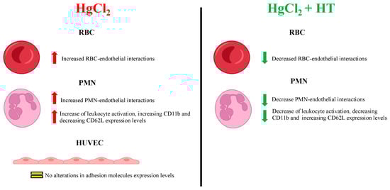 The present study examines the effect of Hg on the adhesion of RBCs and PMNs to the endothelium with the aim of obtaining a clearer picture of the toxic influence of this heavy metal on the cardiovascular system. To determine the molecular mechanisms underlying these processes, the expression of various adhesion molecules is analyzed. Furthermore, to gain a more comprehensive understanding of the protective effect of hydroxytyrosol in this context, we explore its effects on all the parameters studied. Our research helps shed light on the molecular mechanisms involved in the protective effects of hydroxytyrosol against Hg-induced vascular toxicity.