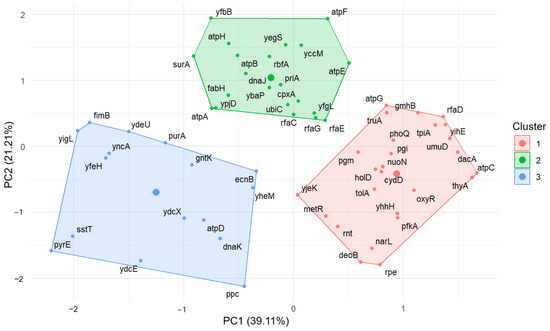 - When exposed to an acidic pH, the median growth defect for all mutants across the clusters was less than 0. However, the first cluster exhibited the highest median growth defect at −46.39 [−59.36; −38.08], which was statistically significantly higher than that of the other clusters. The medians of the second and third clusters did not differ significantly from each other, with values of −81.65 [−89.11; −70.02] for cluster 2 and −91.61 [−101.53; −83.61] for cluster 3.