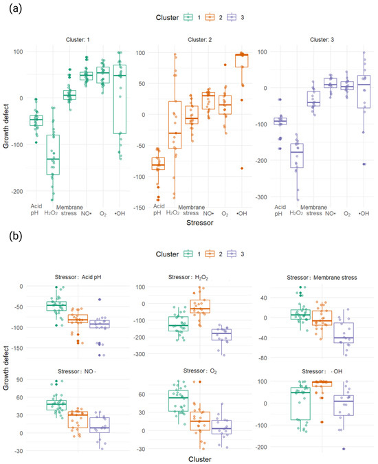 - In the presence of H2O2, the median growth defect remained less than 0 in all clusters, with statistically significant differences observed between each pair of clusters. The second cluster showed the largest growth defect, at −177.62 [−219.96; −154.38], while the first cluster exhibited the smallest defect at −29.96 [−55.11; −21.01].