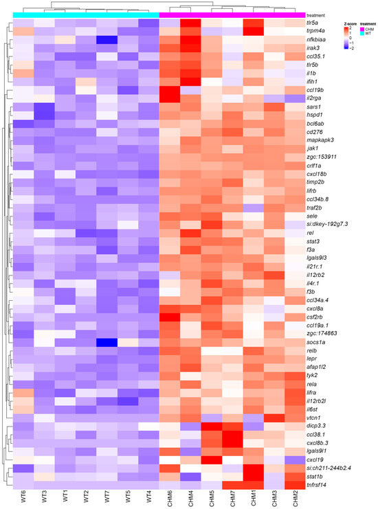 Cytokine pathway is upregulated in chmru848 zebrafish retina. chmru848 zebrafish samples are indicated in magenta and wt samples are indicated in cyan.