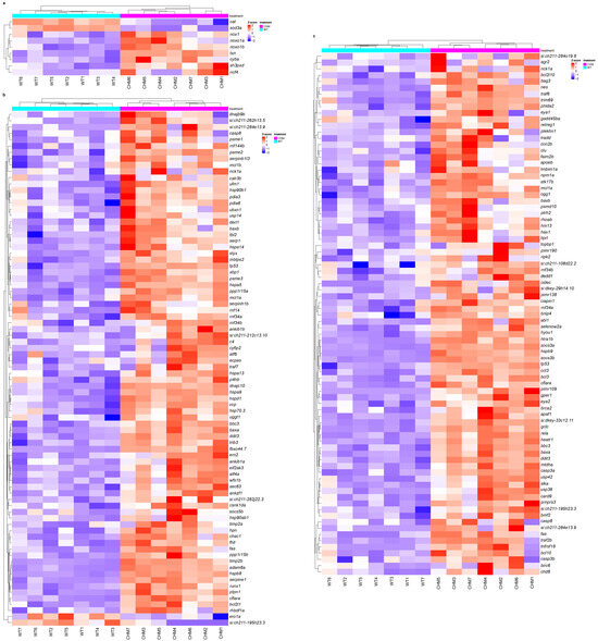 Oxidative (a), ER stress (b) and apoptosis (c) markers are upregulated in the chmru848 zebrafish retina. chmru848 zebrafish are indicated in magenta and wt samples are indicated in cyan.