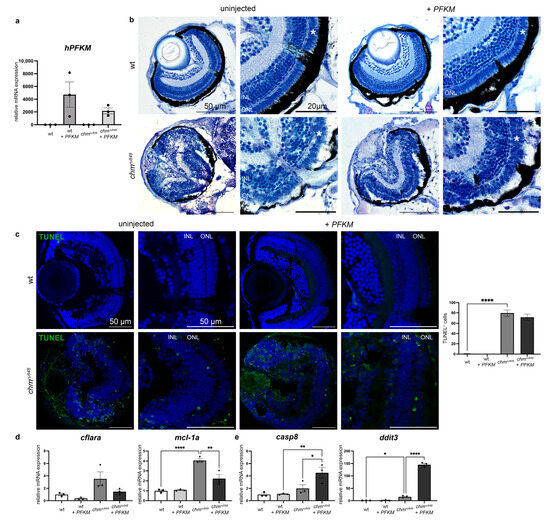 The retinal phenotype of the chmru848 zebrafish at 5 dpf showed a loss of lamination, widespread pyknotic nuclei from cell death, RPE hypertrophy and atrophy, and a small cataractous lens (Figure 4a). In order to investigate whether enhancing glucose metabolism improves photoreceptor survival, we delivered human PFKM, encoding a key glycolytic pathway enzyme into chmru848 zebrafish at the 1–2 cell stage. Human PFKM expression was seen at 5 dpf in injected zebrafish (Figure 4a). At 5 dpf, injected and uninjected wt controls showed normal retinal lamination and no sign of toxicity or cell death (Figure 4b,c). The phenotype in PFKM-treated chmru848 mutant embryos showed partial rescue at 5 dpf with a largely intact photoreceptor layer and thicker RPE compared to the uninjected mutants. TUNEL assay at 5 dpf in chmru848 mutant embryos showed high levels of apoptosis in the retina (Figure 4c). PFKM injection in chmru848 mutants did not reduce the number of apoptotic cells. RT-qPCR analysis confirmed the RNAseq results, showing the upregulation of the anti-apoptotic marker mcl-1a and the upregulation of the pro-apoptotic marker ddit3 in chmru848 zebrafish (Figure 4d,e and Supplementary Table S5). While cflara expression remained unchanged after treatment, but pro-apoptotic markers casp8 and ddit3 were upregulated with the partial restoration of mcl-1a expression.