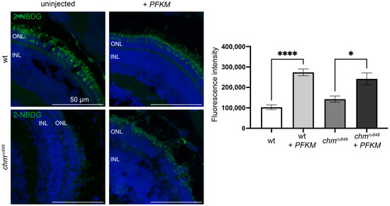 PFKM overexpression rescues 2-NBDG uptake in photoreceptors in chmru848 retina at 5 dpf. Scale bar = 50 μm. 2-NBDG is in green; nucleus stained with DAPI (blue). * p < 0.05; **** p < 0.0001.