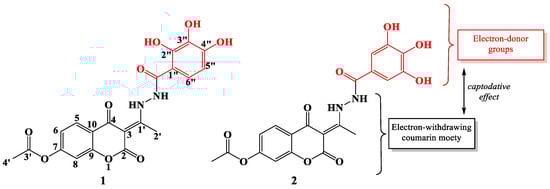 The synthesis of new and potentially better antioxidants has been a challenge for scientists in recent decades. Special emphasis was placed on the synthesis of compounds designed to possess antioxidant properties comparable to those of natural antioxidants. The advantage is that these compounds are often more stable and cheaper to produce, and better stability of food products can be achieved. As part of this study, the mechanisms of antiradical activity of previously synthesized coumarin-hydroxybenzohydrazide derivatives of polyhydroxy acids: (E)-2,4-dioxo-3-(1-(2-(2″,3″,4″-trihydroxybenzoyl)hydrazineyl)ethylidene)chroman-7-yl acetate (1) and (E)-2,4-dioxo-3-(1-(2-(3″,4″,5″-trihydroxybenzoyl)hydrazineyl)ethylidene)chroman-7-yl acetate (2) were investigated (Figure 1) [17].