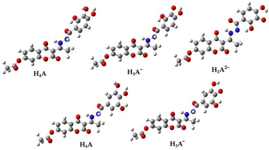 By analyzing the geometries of the acid-base species, it was expected that the structure H2A2− (Figure 3) would be stabilized by the intramolecular hydrogen bond O2″–H---N2. Despite numerous attempts, the equilibrium geometry of this structure has not been found. Specifically, in the optimization process, the hydrogen atom originating from the –NH group undergoes a spontaneous transition to the O-2″ atom, resulting in the formation of a significantly more stable planar geometry. For this reason, further studies on the mechanism of antiradical activity were performed on the more stable acid-base H2A2− species (Figure 3).