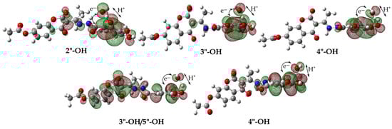 Hydrogen atom transfer (HAT/PCET) from the –OH groups of neutral H4A species of both compounds occurs via the transition state geometries shown in Figure S12. The similarity between the values of the rate constants estimated by the TST (Table S3) and ZCT_0 (Table 2) methods suggests that both approaches can be used to estimate rate constants at room temperature. Based on the obtained data, it can be concluded that hydrogen atom transfer exhibits the highest rate constant in the 2″-OH (1, 2.22 × 107 M−1s−1) and 4″-OH (2, 3.05 × 105 M−1s−1) positions. This implies that thermodynamically favored products are also kinetically favorable.