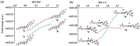 Energy profile for the (a) HAT/PCET reaction pathway between H3A• of compound 1 (4″OH) and HO•; (b) RCF reaction pathway between H3A• of compound 2 (C-3) and HO• in the singlet (blue) and triplet (red) spin states. Interatomic distances are given in angstroms [Å]. Legend: grey—carbon atom, white—hydrogen atom, red—oxygen atom, blue—nitrogen atom.