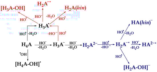Thermodynamically favored reaction pathways between the most abundant acid-base species of investigated compounds and reactive radical species HO•. The black color describes the thermodynamically favored reaction mechanisms between neutral species H4A and HO•. The red color describes the favored reaction mechanisms between monoanionic species H3A− and HO•, while the blue color describes the reaction mechanisms between dianionic species H2A2− and HO•.