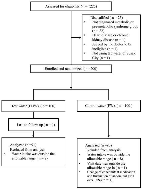 From this population, 225 Susaki Citizens aged ≥30 years who could install a test water conditioner were recruited at public spaces in Susaki City. After screening for eligibility at two hospitals in Susaki City, 25 of the 225 patients were disqualified because they did not meet inclusion criteria (Table 1) or met exclusion criteria (Table 2). Within these 25 cases, 22 cases were not diagnosed as a metabolic or pre-metabolic syndrome group, 1 case had heart disease or chronic kidney disease, 1 case was judged by the doctor to be ineligible for participation due to other reasons, and 1 case was judged to be ineligible for participation as the participant did not use the tap water of Susaki City. The 200 eligible cases were randomly allocated to EHW or FW groups. After randomization, one case in the EHW group was discontinued, there was a change in concomitant medication and fluctuation of waist circumference of over 10% in one case of the FW group, water intake was outside the allowable range in 16 cases (8 cases in the EHW group and 8 cases in the FW group), and the visit date was outside the allowable range in one case of the FW group. A total of 181 cases (91 cases in the EHW group and 90 cases in the FW group were analyzed (Figure 1).