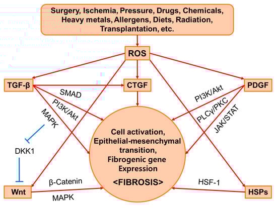 Common mediators of fibrosis. Surgery, ischemia, pressure, drugs, chemicals, heavy metals, allergens, diets, radiation, transplantation, etc. stimulate the production of intracellular reactive oxygen species (ROS) and cause oxidative damage, structural deformation, and functional abnormalities in various organs. These stresses stimulate the expression of transforming growth factor beta (TGF-β), platelet-derived growth factor (PDGF), Wnt, heat shock proteins (HSPs), etc. The canonical TGF-β signaling pathway is mediated by the small mothers against decapentaplegic (SMAD) and induces the expression of the target genes. As a result, the expression of connective tissue growth factor (CTGF) is induced and the signaling pathway that it mediates is activated. Additionally, the noncanonical TGF-β signaling pathway activates the Wnt signaling pathway by suppressing Dickkopf-1 (DKK1) through an extracellular signal-regulated kinase (ERK)-dependent mechanism. The activation of the canonical Wnt signaling pathway activates β-catenin and induces the expression of the target genes. The TGF-β, CTGF, and Wnt signaling pathways cooperatively induce cell activation, epithelial–mesenchymal transition (EMT), and the expression of fibrogenic genes, such as alpha-smooth muscle actin (α-SMA) and collagens to promote fibrogenesis. Sharp red arrows (→) indicate stimulation, and blunt blue arrows (⊥) indicate suppression.