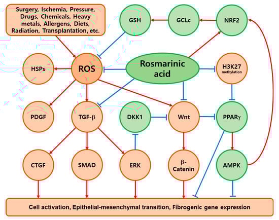 Hypothetical mechanisms of the antifibrotic action of rosmarinic acid (RA). RA can remove ROS and suppress cell activation, EMT, and fibrogenic gene expression by inhibiting the stress-induced expression of TGF-β, CTGF, and Wnt and their signaling pathways. Peroxisomal proliferator-activated receptor (PPAR) γ is repressed in myofibroblastic cells, and RA restores the gene expression of PPAR γ through an epigenetic mechanism that reduces the methylation of histone H3 lysine 27 (H3K27). PPARγ activates 5′ AMP-activated protein kinase (AMPK), which inhibits cell activation, EMT, and fibrogenic gene expression. RA also activates the nuclear factor erythroid 2-related factor (NRF) 2 via multiple mechanisms to induce the transcriptional expression of phase II/antioxidant enzymes, and the increased expression of catalytic subunits of glutamate cysteine ligase (GCLc) promotes the synthesis of glutathione (GSH), thereby reducing ROS. Collectively, RA alleviates oxidative stress and maintains the structural and functional integrity of the organs through multiple mechanisms. Profibrotic and antifibrotic factors are shown in brown and green circles, respectively. Sharp red arrows (→) indicate stimulation, and blunt blue arrows (⊥) indicate suppression.