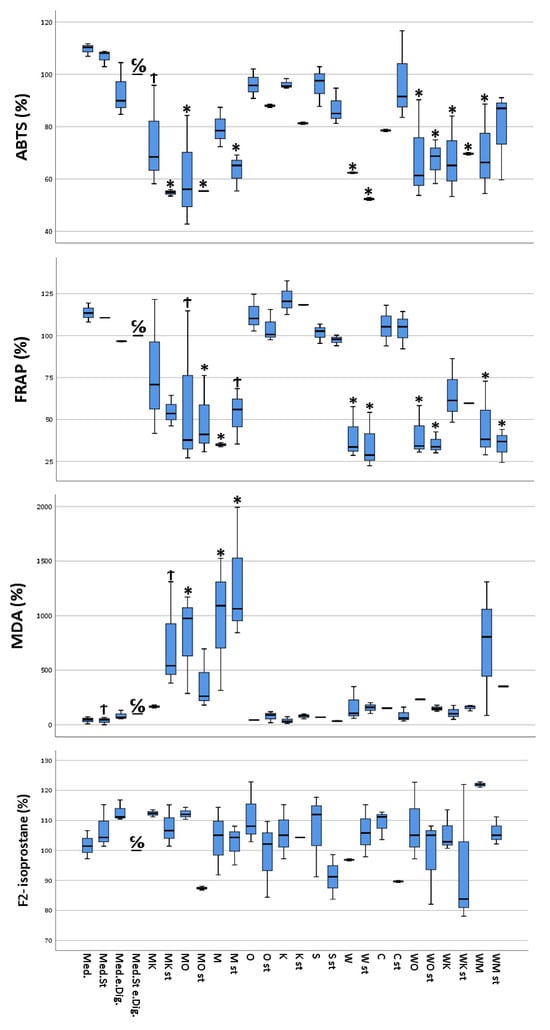 Multivariate analysis using Dunnett’s test comparing antioxidant and pro-oxidant (ABTS, MDA, FRAP, and F2-isoprostane) activity of selected food items and their combinations following simulated gastro-intestinal digestion in differentiated Caco-2 cell monolayers. All values were measured following the lysis of Caco-2 cells. All values are expressed as percentages compared to their controls (medium plus stimuli and “empty digesta” (digesta without any food item)). Abbreviations: med = medium (blank); med.st. = medium + stimuli; med.e.dig = medium + empty digesta; med.st.e.dig. = medium + stimuli + empty digesta; MK = sausage (meat) + coffee; MK st = sausage (meat) + coffee + stimuli; MO = sausage (meat) + orange juice; MO st = sausage (meat) + orange juice + stimuli; M = sausage (meat); M st = sausage (meat) + stimuli; O = orange juice; O st = orange juice + stimuli; K = coffee; K st = coffee + stimuli; S = soda; S st = soda + stimuli; W = white chocolate; W st = white chocolate + stimuli; C = curcumin; C st = curcumin + stimuli; WO = white chocolate + orange juice; WO st = white chocolate + orange juice + stimuli; WK = white chocolate + coffee; WK st = white chocolate + coffee + stimuli; WM = white chocolate + sausage (meat); WM st = white chocolate + sausage (meat) + stimuli. C/O = control group; Ϯ = trend (0.05 > p-value > 0.1); * The mean difference was significant at the 0.05 level (Dunnett’s post hoc test). Tests of between-subjects effects indicated statistically significant differences.