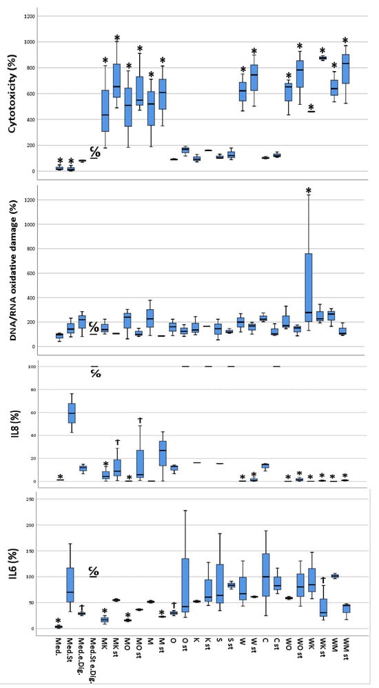 Multivariate analysis using Dunnett’s test comparing cytotoxicity, DNA/RNA oxidative damage, and inflammatory activity (IL-6 and IL-8) of selected food items and their combinations following simulated gastro-intestinal digestion in differentiated Caco-2 cell monolayers. IL-6 and IL-8 were measured in the cellular supernatants, DNA/RNA in the lysed cells, and cytotoxicity as described in materials and methods. All values were measured following the lysis of Caco-2 cells. All values are expressed as percentages compared to their controls (medium plus stimuli and “empty digesta” (digesta without any food item). Abbreviations: med = medium (blank); med.st. = medium + stimuli; med.e.dig = medium + empty digesta; med.st.e.dig. = medium + stimuli + empty digesta; MK = sausage (meat) + coffee; MK st = sausage (meat) + coffee + stimuli; MO = sausage (meat) + orange juice; MO st = sausage (meat) + orange juice + stimuli; M = sausage (meat); M st = sausage (meat) + stimuli; O = orange juice; O st = orange juice + stimuli; K = coffee; K st = coffee + stimuli; S = soda; S st = soda + stimuli; W = white chocolate; W st = white chocolate + stimuli; C = curcumin; C st = curcumin + stimuli; WO = white chocolate + orange juice; WO st = white chocolate + orange juice + stimuli; WK = white chocolate + coffee; WK st = white chocolate + coffee + stimuli; WM = white chocolate + sausage (meat); WM st = white chocolate + sausage (meat) + stimuli. C/O = control group; Ϯ = trend (0.05 > p-value > 0.1); * The mean difference was significant at the 0.05 level (Dunnett’s post hoc test). Tests of between-subject effects were statistically significant except for DNA/RNA oxidative damage (p = 0.089).