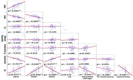 Spearman ranks correlations between inflammatory and oxidative stress, DNA/RNA oxidative damage, and cytotoxicity variables. The highest positive correlation was found between MDA and cytotoxicity. The highest negative correlation was observed between cytotoxicity and ABTS. * Correlation was significant at the <0.05 level (2-tailed) ** Correlation was significant at the <0.01 level (2-tailed).