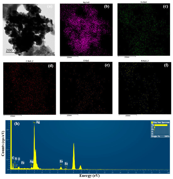 Figure 1. Transmission electron microscopic (TEM) image of starch–silver nitroprusside nanoparticles (S-AgNP NPs) (a); elemental (Ag, Fe, C, O, N) mapping of S-AgNP NPs (bf); elemental spectrum of S-AgNP NPs (h).