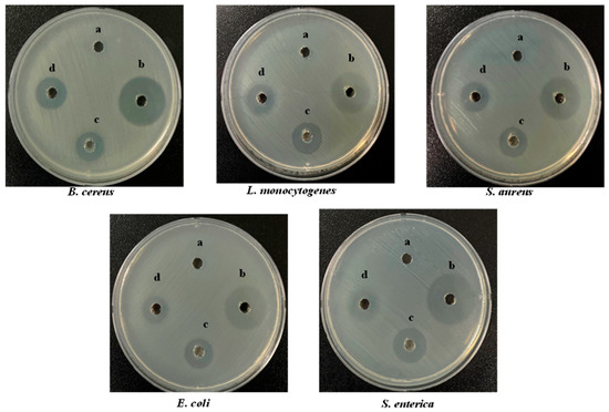 L. monocytogenes0.00 d6.33 ± 0.24 c10.67 ± 0.47 b18.80 ± 0.30 a