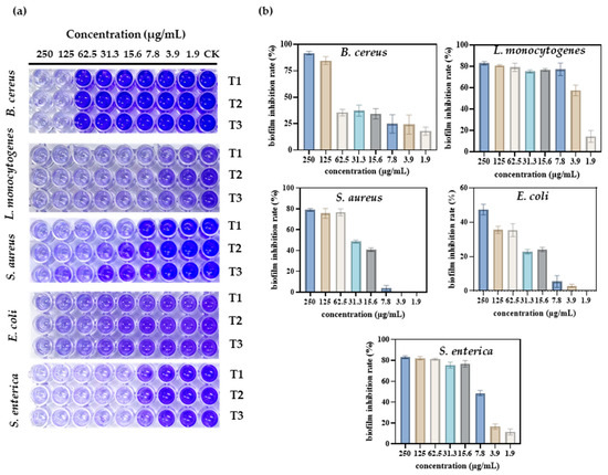 Figure 5. Antibacterial activity of different concentrations of S-AgNP NPs on different bacterial pathogens. Visual image of the anti-biofilm assay in a 96-well plate (a); biofilm inhibition rate of S-AgNP NPs (b). T1, T2, and T3 indicate each of the experiments’ triplicate results.