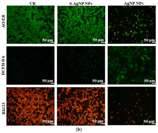 AO/EB staining assay was performed using a previously reported protocol [21]. Samples consisted of cells that were processed for 24 h, after which the cells were washed with PBS and removed. Then, 10 μL dye mixture (1:1) was subjected to AO/EB staining. The cell morphology was observed under a fluorescence microscope. The DCFH-DA was used to assess the ROS expression levels in control and S-AgNP NPs-treated NIH3T3 cells. After cells were grown to 80% in 24-well plates, NIH3T3 cells were washed with PBS after incubation to remove excess dead cells and medium. Then, cells were stained by using DCFH-DA for 15 min and observed under the fluorescence microscope [22]. Rh123 associated with changes in cellular mitochondrial membrane potential. Sample-treated cells were cultured for 24 h. Then, the floating cells were removed and washed with PBS. The cells were stained by adding 10 μL of Rh123 for 15 min, and Rh123 was washed off. Cells were then observed under a fluorescence microscope and photographed [23].