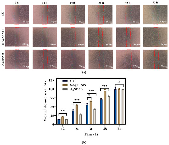 Figure 8. In vitro scratch wound healing assay of NIH3T3 cells in the presence of S-AgNP NPs and AgNP NPs monitored with light-inverted microscopy (a). The red dotted line represents the area of the wound scratch. Bar graph illustrating percentage wound closure at indicated time points (0, 12, 24, 36, 48, and 72 h after the initiation of the scratch when the cells were treated with the 62.5 μg/mL concentration of S-AgNP NPs and 7.8 μg/mL concentration of AgNP NPs during the scratch wound assay) (b). ** p < 0.01, *** p < 0.001 represents a significant difference between control, S-AgNP NPs, and AgNP NPs each time. ns means no significance.