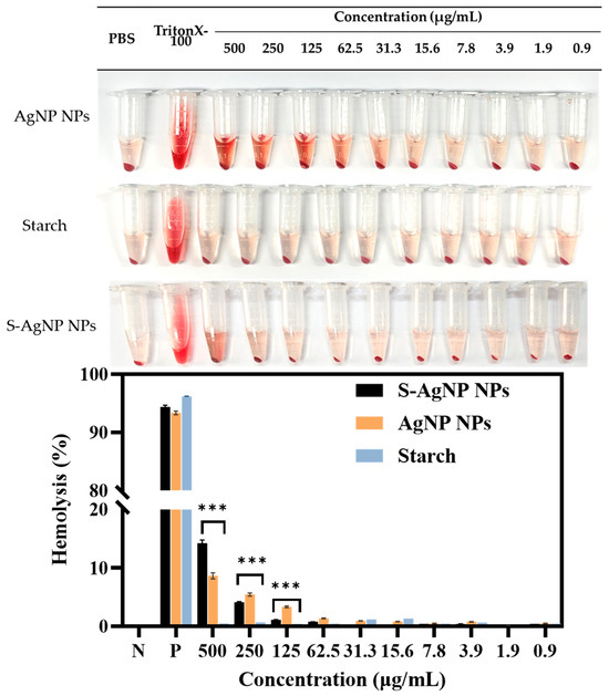 The safety and hemocompatibility of S-AgNP NPs were determined by hemolysis assay. The results (Figure 9) showed that S-AgNP NPs were hemolytic only at 500 μg/mL, with a hemolysis rate of 13.20%. S-AgNP NPs had a hemolysis rate of less than 5% at all other concentrations (1.9 to 250 μg/mL). AgNP NPs caused hemolysis at both 250 and 500 μg/mL. The hemolysis rates were 5.45% and 8.64%, respectively. Starch does not cause significant hemolysis of blood cells. AgNP NPs have good biocompatibility at low concentrations [13]. In particular, the hemolysis rate of S-AgNP NPs at 250 μg/mL is significantly lower than that of AgNP NPs. After 24 h incubation, S-AgNP NPs were still able to show a lower rate of hemolysis than AgNP NPs (Figure S4). In general, the rate of hemolysis caused by nanoparticles is related to the particle size and concentration of the nanoparticles. The smaller the particle size, the stronger the hemolysis caused by the nanoparticles [48]. The negative charge on the nanoparticles may prevent the erythrocytes from interacting with the nanoparticles, which reduces hemolysis [49]. Starch causes blood cells to aggregate and acts as a protective agent for blood cells [50]. Overall, the weak hemolysis caused by S-AgNP NPs is attributed to their particle size and negative charge potential.