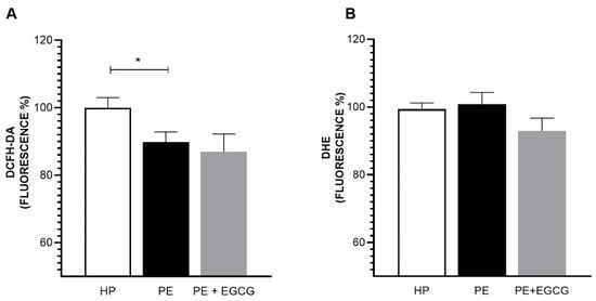Levels of total ROS and O2•−. Total ROS was measured by DCFH-DA and O2•− by DHE. (A) The reactive oxygen species levels in the PE group were lower when compared to the HP group, and the EGCG (100 μM) treatment did not change these levels. (B) Superoxide levels were similar in all groups. ROS and O2•− levels are presented in fluorescence percentages based on the HP group. Data are presented as mean ± SEM, and comparisons between groups were assessed by (A) One-Way ANOVA test followed by Dunnet’s Multiple Comparison Test and (B) Kruskal–Wallis test followed by Dunn’s Multiple Comparison Test. * p < 0.05.