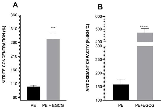 Nitrite levels and antioxidant capacity in cell culture supernatant exposed to shear stress. EC were exposed to shear stress for 72 h, with PE plasma in the last 24 h and in the presence or absence of EGCG in the last 60 min. Then, the supernatant was collected for Griess and FRAP assays. (A) The nitrite level was higher in the group treated with EGCG (100 μM). (B) Antioxidant capacity was also higher in the same group. The results are presented in absorbance percentage based on the HP group, and data are presented as mean ± SEM. Comparisons between groups were assessed using an unpaired t-test. ** p < 0.01; **** p < 0.0001.