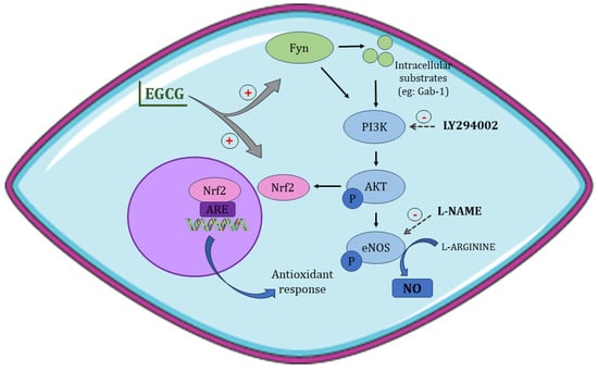 The L-NAME did not change the EGCG action on the antioxidant capacity. However, the use of LY294002 decreased the phytochemical effects. When researching alternative pathways to PI3K/AKT/eNOS that could be involved in the EGCG antioxidant effects, we found some studies that report the action of the nuclear factor Nrf2 [43,44,45]. Some groups point out that EGCG can activate this factor directly or via PI3K, which would explain the decrease in the EGCG antioxidant action after the use of LY294002 [43,45]. After activation, Nrf2, in the nucleus, binds to the antioxidant response element (ARE), triggering the transcription of several antioxidant genes [44]. Moreover, EGCG exhibits a well-documented antioxidant impact, having the capability to directly neutralize oxidizing agents [46]. The LY294002 moderate effect may be due to this direct antioxidant action of EGCG. Nevertheless, further investigations regarding the role of EGCG in this pathway should be performed. An overview of all the mechanisms discussed is presented in Figure 5.