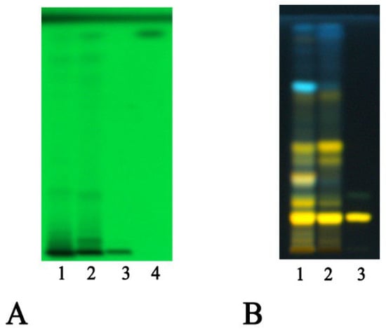 The presence of gallic acid was detected in the ethyl acetate fractions. This phenolic acid appears evident at 254 nm (Figure 1A). Rutin has been shown to be the most abundant flavonoid component (Figure 1B), followed by isoquercetrin and kaempferol 3-O-glucoside-7-O-rhamnoside. The glycosidic flavonoid rutin was detected in the AcOEt fraction of both extracts and is recognizable by the typical yellow spot after derivatization with Natural Product at 366 nm.