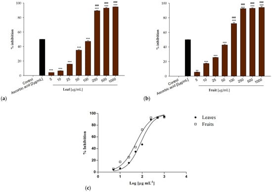 Radical scavenging activity of P. spina-christi Mill extracts from (a) leaf and (b) fruit. (c) Non-linear regressions curves. Data are expressed as mean ± S.E.M. (n = 3). Ascorbic acid (2 µg/mL) was used as positive control. Significant difference versus control: *** p < 0.001; ** p < 0.01; Significant difference versus positive control: ### p < 0.001.