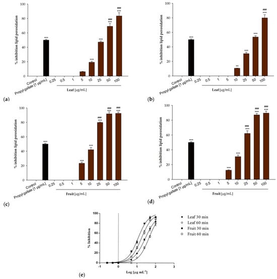 Concentration-dependent inhibition of lipid peroxidation induced by P. spina-christi Mill extracts: (a) leaf extract after 30 min of incubation, (b) leaf extract after 60 min of incubation, (c) fruit extract after 30 min of incubation, (d) fruit extract after 60 min of incubation, (e) Non-linear regressions curves. Data are expressed as mean ± S.E.M. (n = 3). Propyl gallate (1 µg/mL) was used as positive control. Significant difference versus control: *** p < 0.001; ** p < 0.01; Significant difference versus positive control: ### p < 0.001.