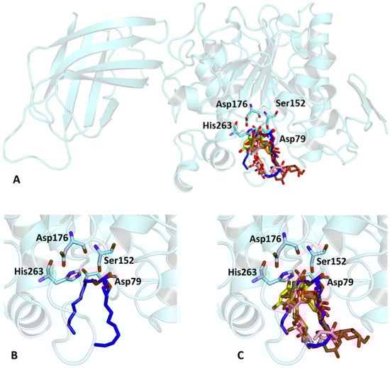 (A) Crystallographic structure of pancreatic lipase corresponding to the PDB entries 1LPB. Protein backbone is represented in background as ribbons and key amino acid residues of the catalytic site are highlighted in cyan. (B) Binding pose of the crystallographic ligand MUP and (C) Superimposed binding modes of the ligands: rutin (pink); quercitrin (gold); kaempferol 3-O-glucoside-7-O-rhamnoside (brown); quercetin (yellow); kaempferol (green).