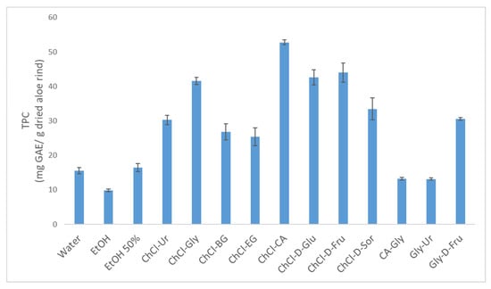The TPC of aloe rind extracts using different green solvents. Extraction conditions: extraction time, 15 min; solvent-to-solid ratio, 150; DES percentage, 70%. Error bars indicate SD (n = 3).