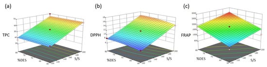 Three-dimensional response surface plots demonstrating the effect of the solvent-to-solid ratio and percentage content of the DES on (a) the TPC, (b) DPPH, and (c) FRAP.