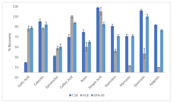 The isolation and recovery of extracted compounds from extracts is challenging due to the negligible vapor pressure of DESs [58,59,60]. In recent years, several approaches have been proposed to facilitate the recovery of valuable extracted compounds, including the applications of anti-solvents, macro-porous resins, and supercritical carbon dioxide [61,62,63,64,65,66]. The SPE procedure has proven to be a simple and efficient method for the isolation of phytochemicals from DES extracts [58,59,67]. Therefore, preliminary studies were performed to select the most suitable cartridge for recovering the extracted phenolics and the ChCl-CA, in different fractions, from the optimal aloe rind extracts. Three commercially available SPE sorbents (Maxi-Clean™ C18, Oasis® HLB, Discovery® DPA-6S), known for their favorable retention properties toward polyphenols, were evaluated for their ability to recover and isolate polyphenols and DESs. The recoveries of the polyphenolic compounds under study on different SPE cartridges, along with the standard deviations (SDs), are presented in Figure 3. Discovery® DPA-6S sorbents demonstrated superior recovery ability of the target compounds and were consequently selected as the most suitable cartridges. A polyamide resin cartridge (DPA-6S) is typically employed for the absorption of polar compounds, particularly polyphenols, through hydrogen bonding between the hydroxyl groups of the compounds and the amide groups of the resin [12].