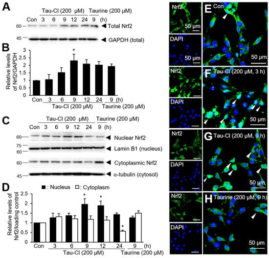 The upregulation and cytoplasmic-to-nuclear translocation of Nrf2 by Tau-Cl in C6 cells. C6 cells were treated with 200 μM of Tau-Cl for 3, 6, 9, 12, or 24 h or with 200 μM of taurine for 9 h. Nrf2 levels in total cell lysates (A,B) or in nuclear and cytosolic fractions (C,D) were determined by immunoblotting. Representative images are presented in A and C, and quantified results are presented as mean ± SEM (n = 3) in (B,D). (E–H) C6 cells were treated with 200 μM of Tau-Cl for 3 or 9 h or with 200 μM of taurine for 9 h. Double immunofluorescence staining was performed using anti-Nrf2 antibody and DAPI. Arrowheads indicate Nrf2 in the nucleus. The scale bar represents 50 μm. * p < 0.05 versus untreated controls.