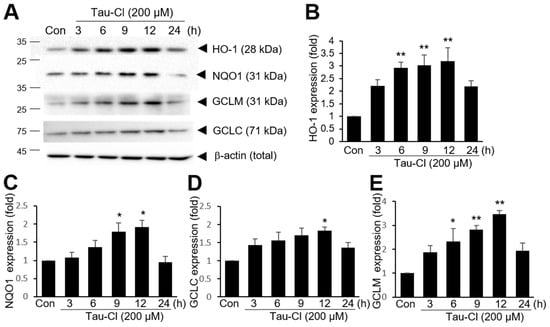 Because Nrf2 induces the expression of various antioxidant genes, we investigated whether Tau-Cl upregulates the expression of antioxidant genes in C6 cells. C6 cells were treated with 200 μM Tau-Cl for 3, 6, 9, 12, or 24 h. HO-1 expression significantly increased after 6 h of 200 μM Tau-Cl treatment, reached the maximum level at 12 h, and subsequently decreased (Figure 2A,B). Similarly, Tau-Cl significantly induced NQO1, GCLC, and GCLM in C6 cells; however, the timing of induction differed for each gene (Figure 2). Collectively, these results suggest that Tau-Cl activates Nrf2 and induces the upregulation of various antioxidant genes in astrocytes.