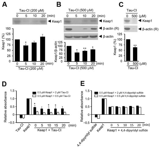 Modification of the thiol groups of Keap1 by Tau-Cl. (A–C) C6 cells were incubated with 200 or 500 μM Tau-Cl and the cell lysates were reacted with Biotin-iodoacetamide (IAA). IAA-bound Keap1 was precipitated, subjected to SDS-PAGE, and determined by immunoblotting with anti-Keap1 antibody. The quantified results are presented as mean ± SEM (n = 5 for (A,B), n = 4 for (B)). * p < 0.05 and ** <0.01 versus untreated controls. (D,E) 0.5 and 2 μM Tau-Cl (D) or 4,4′-dipyridyl disulfide (E) were added to 0.5 μM Keap1 solution, and the changes in the absorbance at 325 nm were monitored for 20 min at intervals of 5 min. The quantified results are presented as mean ± SEM (n = 3 for (D) and n = 1 for (E)). * p < 0.05 versus 0.5 μM Keap1.