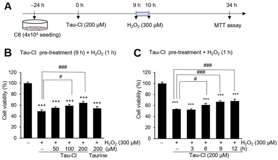 Protection of H2O2-treated C6 cells by Tau-Cl. (A) Schematic diagram of time points for treatment of Tau-Cl and H2O2 and cell viability assay. (B) C6 cells were pre-treated with Tau-Cl (50, 100, or 200 μM) or taurine (200 μM) for 9 h and then treated with H2O2 (300 μM) for 1 h. (C) C6 cells were pre-treated with 200 μM of Tau-Cl for 3, 6, 9, or 12 h and then treated with H2O2 (300 μM) for 1 h. For all experiments, MTT assays were performed 24 h after H2O2 treatment and cell viabilities are presented as mean ± SEM (n = 8). *** p < 0.001 versus untreated controls, # p < 0.05 and ### p < 0.001 between indicated groups.